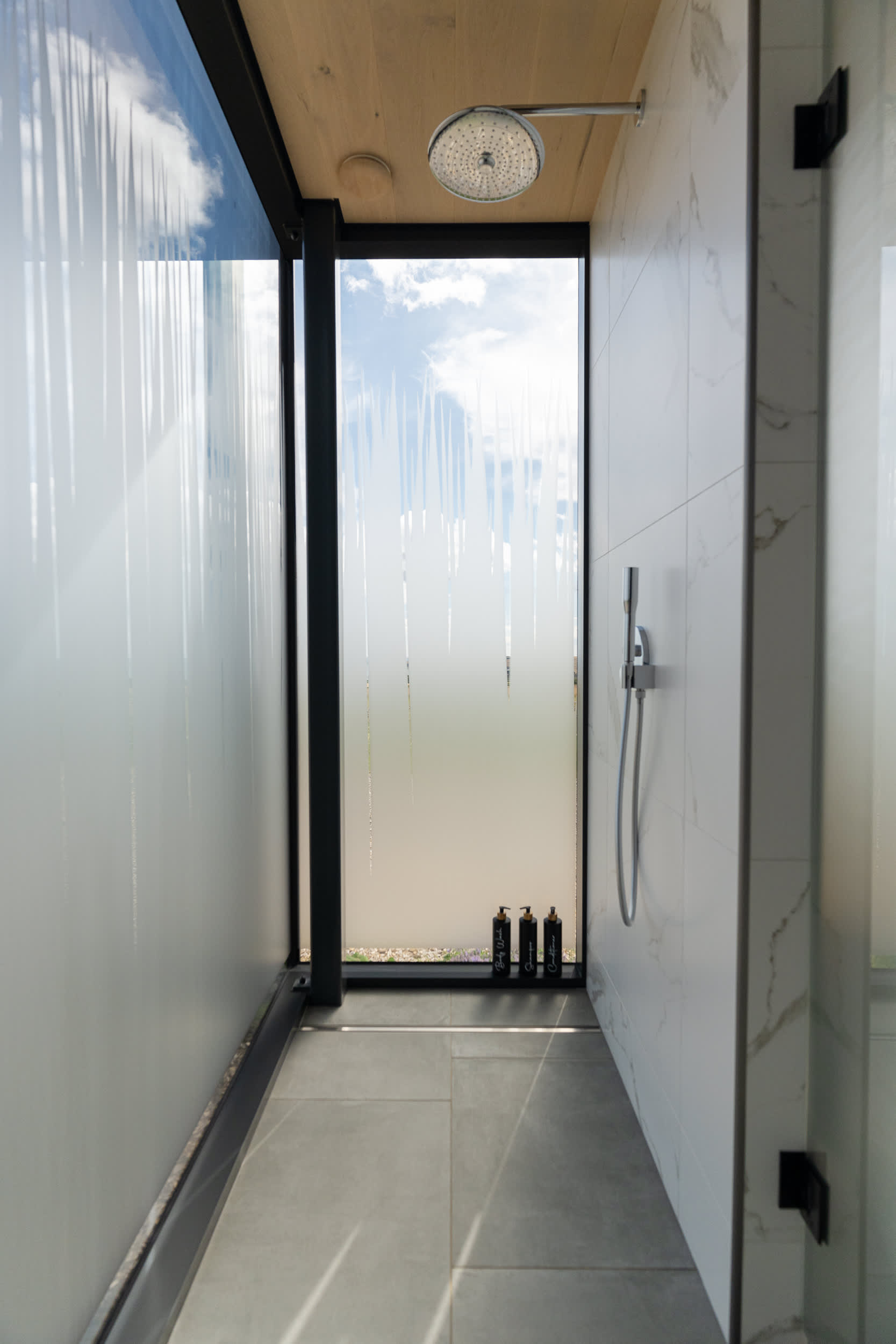 The bathroom includes a walk-in shower with luxury fittings, designed with the same considered simplicity as the rest of the cabin.